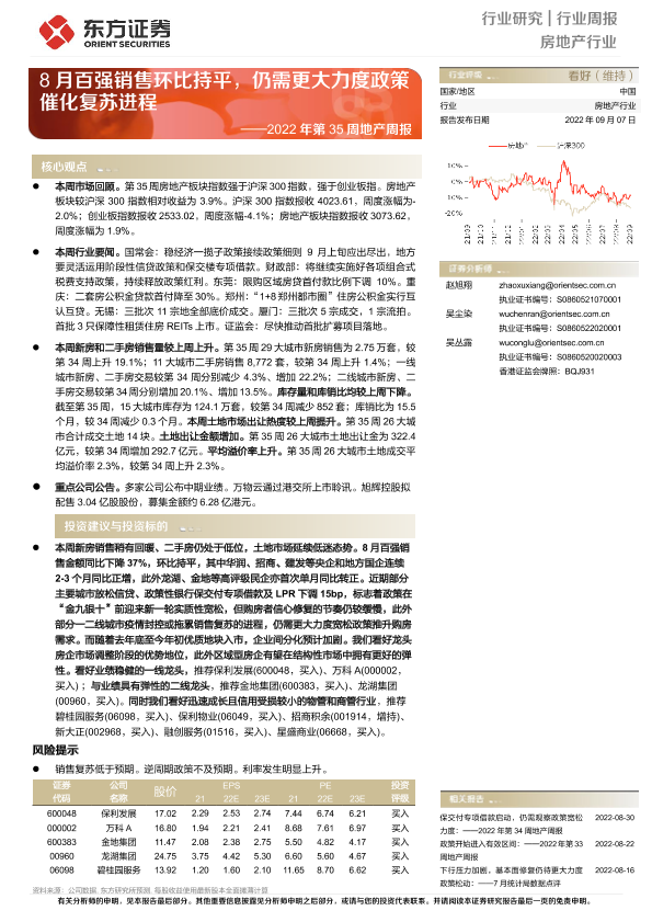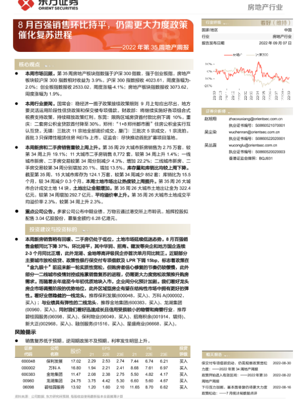 【东方证券】【20220907】房地产行业2022年第35周地产周报:8月百强销售环比持平,仍需更大力度政策催化复苏进程-17页