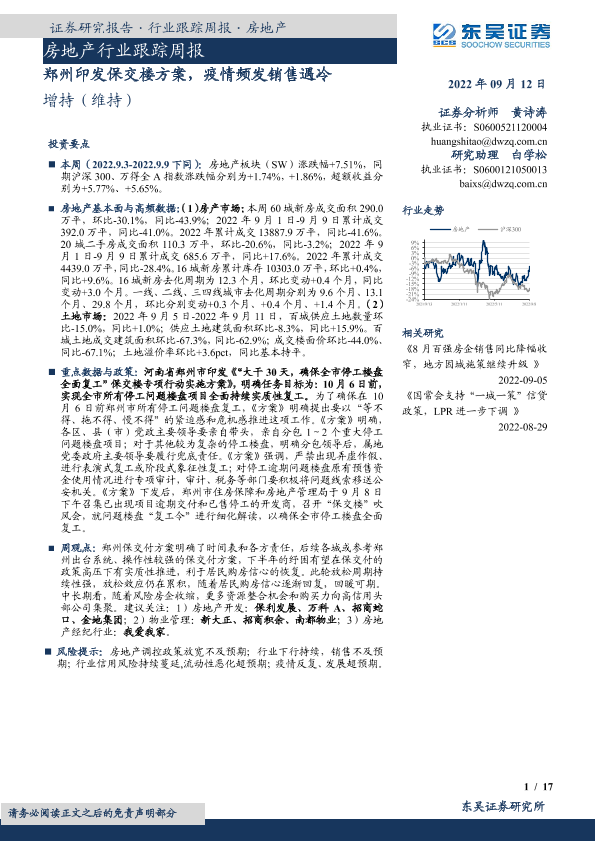 【东吴证券】【20220912】房地产行业跟踪周报:郑州印发保交楼方案,疫情频发销售遇冷-17页