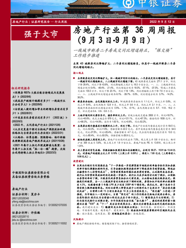 【中银证券】【20220912】房地产行业第36周周报:一线城市新房二手房成交同比增速转正,“保交楼”工作稳步推进-33页