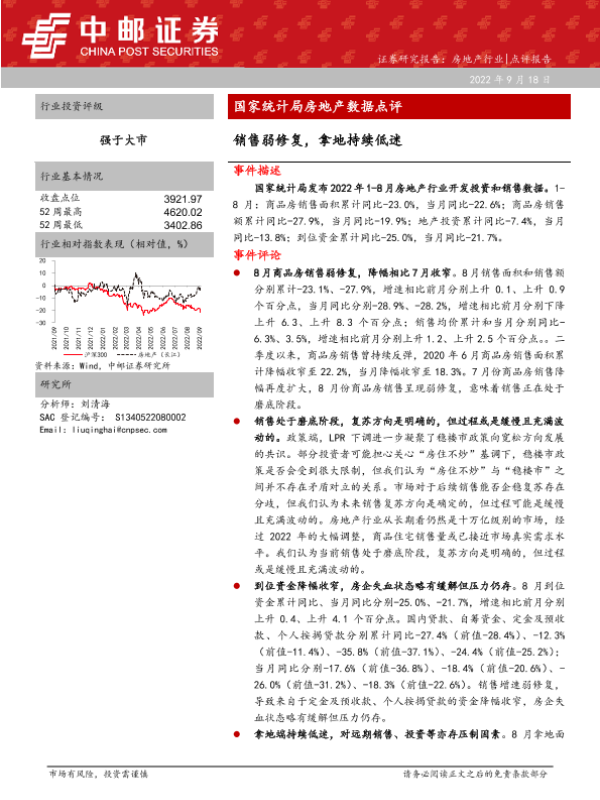 【中邮证券】【20220918】国家统计局房地产数据点评:销售弱修复,拿地持续低迷-12页