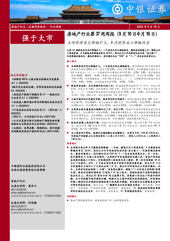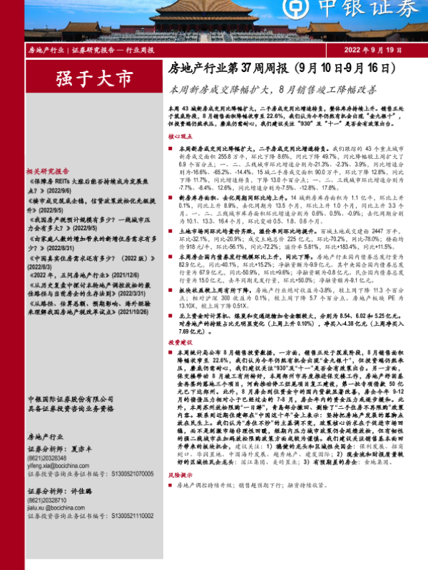 【中银证券】【20220919】房地产行业第37周周报:本周新房成交降幅扩大,8月销售竣工降幅改善-32页