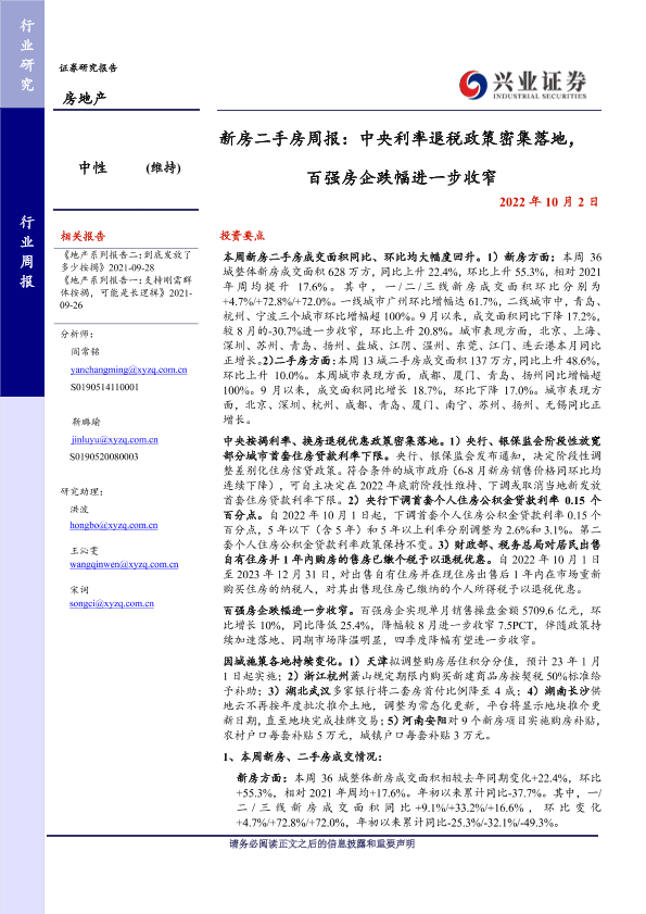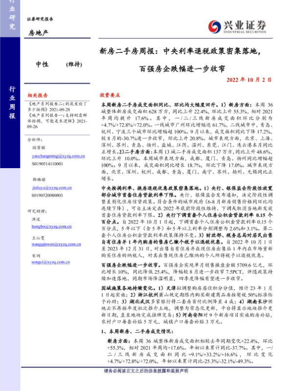 【兴业证券】【20221008】新房二手房周报:中央利率退税政策密集落地,百强房企跌幅进一步收窄-26页