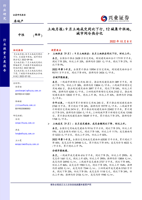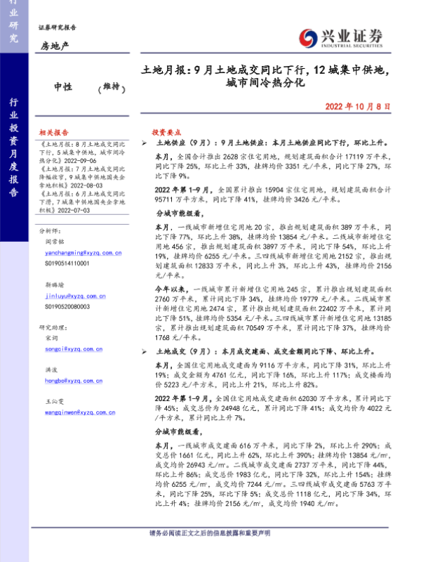 【兴业证券】【20221008】9月土地成交同比下行,12城集中供地,城市间冷热分化-14页
