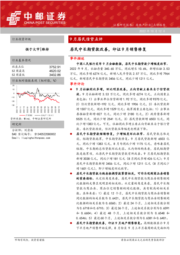 【中邮证券】【20221012】房地产行业9月居民信贷点评:居民中长期贷款改善,印证9月销售修复-11页