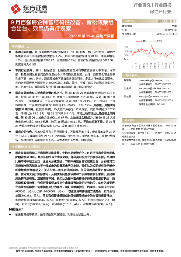 【东方证券】【20221014】2022年第39-40周地产周报:9月百强房企销售结构性改善,宽松政策组合出台、效果仍有待观察-16页