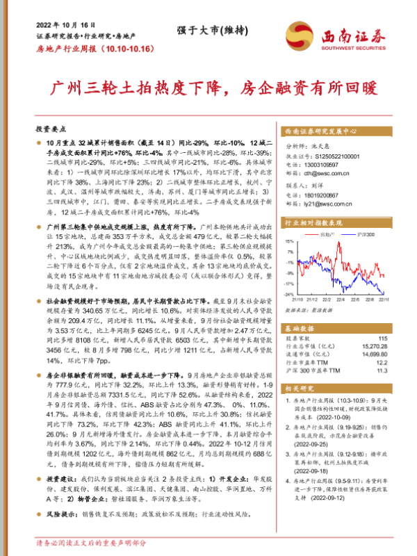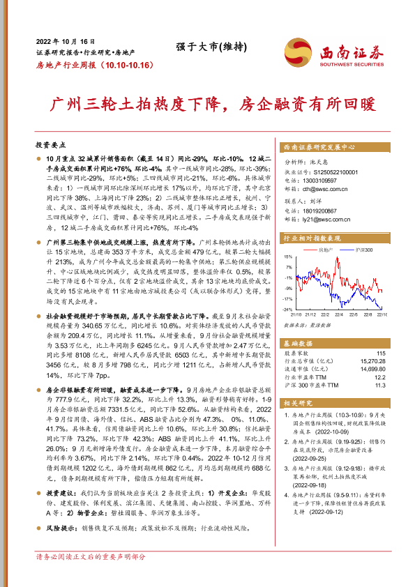 【西南证券】【20221016】房地产行业周报:广州三轮土拍热度下降,房企融资有所回暖-15页