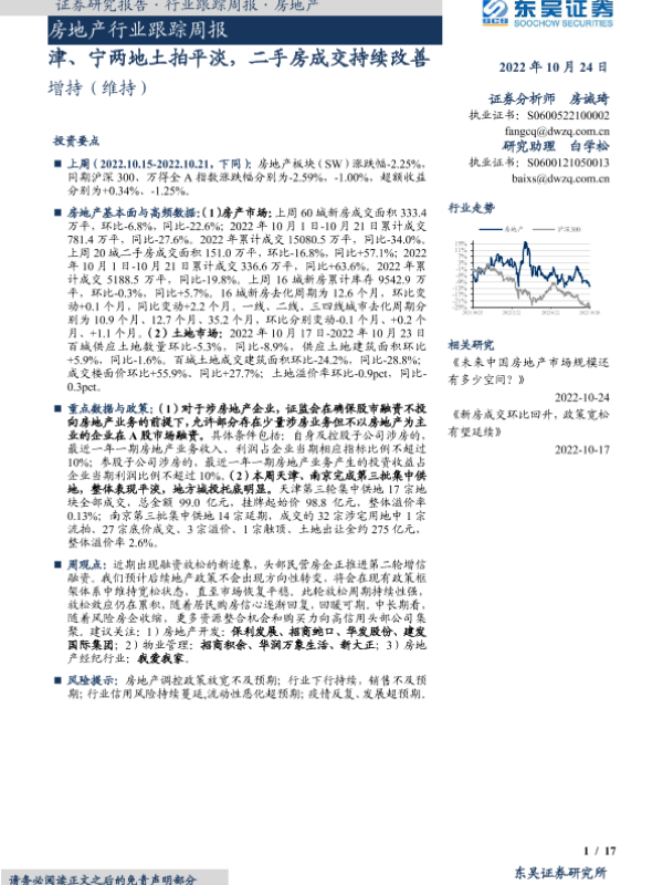 【东吴证券】【20221024】房地产行业跟踪周报:津、宁两地土拍平淡,二手房成交持续改善-17页