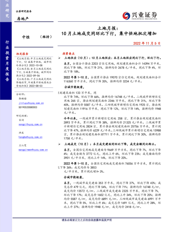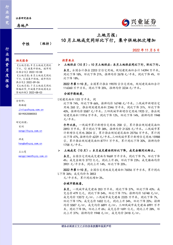 【兴业证券】【20221105】10月土地成交同环比下行,集中供地批次增加-11页