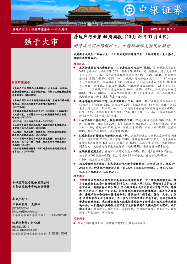 【中银证券】【20221107】房地产行业第44周周报:新房成交同比降幅扩大,中债增持续支持民企融资-32页