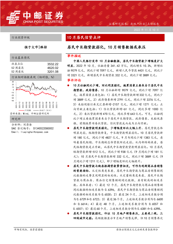 【中邮证券】【20221110】10月居民信贷点评:居民中长期贷款弱化,10月销售数据或承压-11页