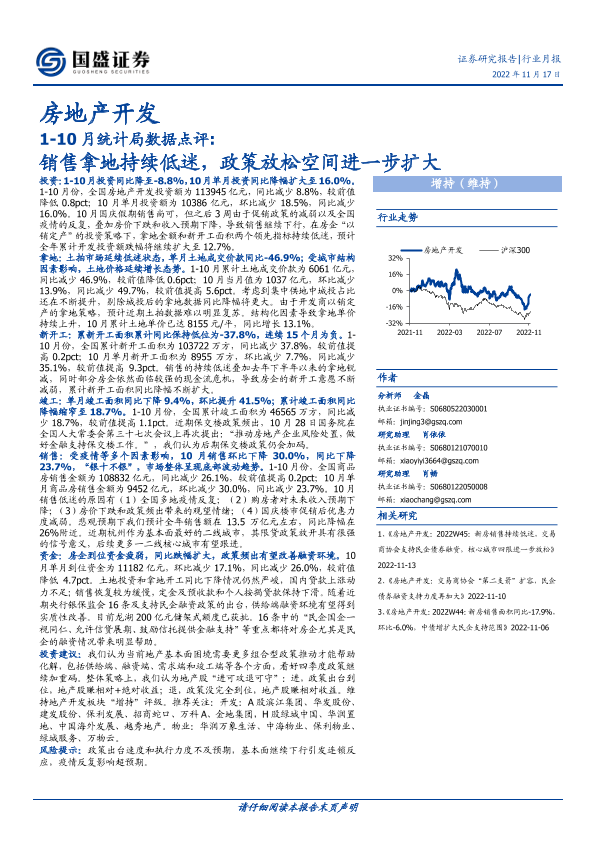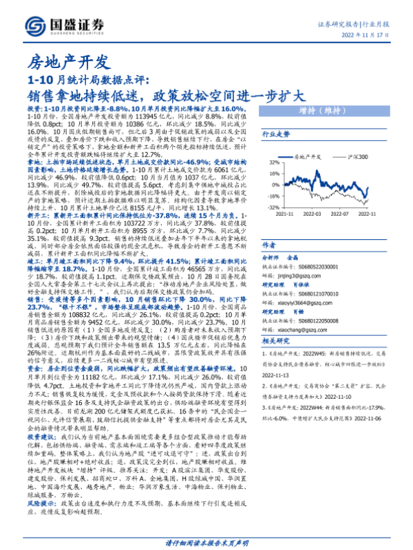 【国盛证券】【20221117】1-10月统计局数据点评:销售拿地持续低迷,政策放松空间进一步扩大-15页