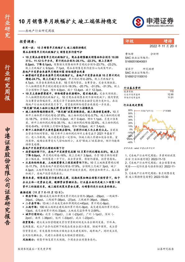 【申港证券】【20221120】10月销售单月跌幅扩大 竣工端保持稳定-13页