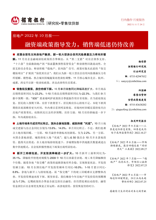 【招商银行】【20221124】房地产2022年10月报:融资端政策指导发力,销售端低迷仍待改善-20页