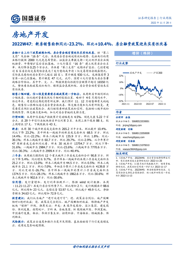 【国盛证券】【20221128】房地产开发行业周报2022W47:新房销售面积同比-23.2%,环比+10.4%,房企融资政策迎来实质性改善-14页