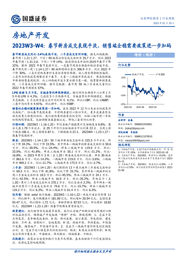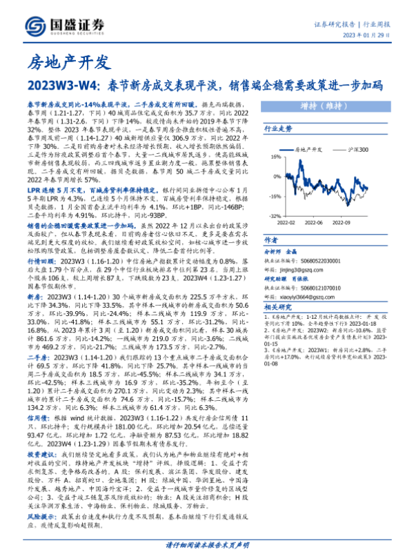【国盛证券】【20230129】房地产开发2023W3-W4:春节新房成交表现平淡,销售端企稳需要政策进一步加码-14页