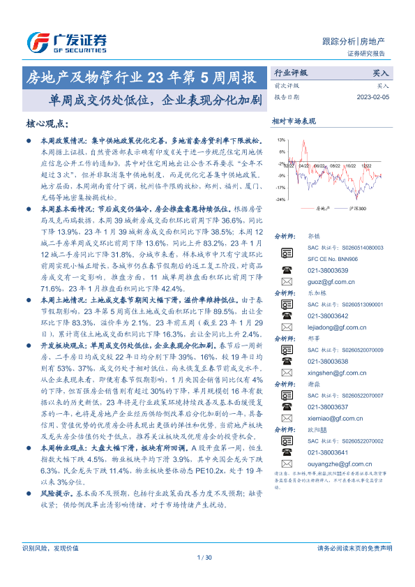 【广发证券】【20230205】房地产及物管行业23年第5周周报:单周成交仍处低位,企业表现分化加剧-30页