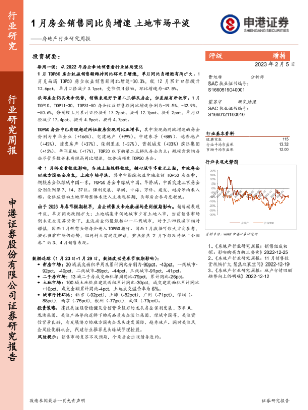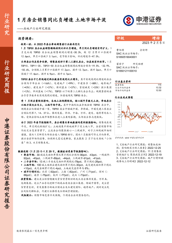 【申港证券】【20230205】1月房企销售同比负增速 土地市场平淡-11页