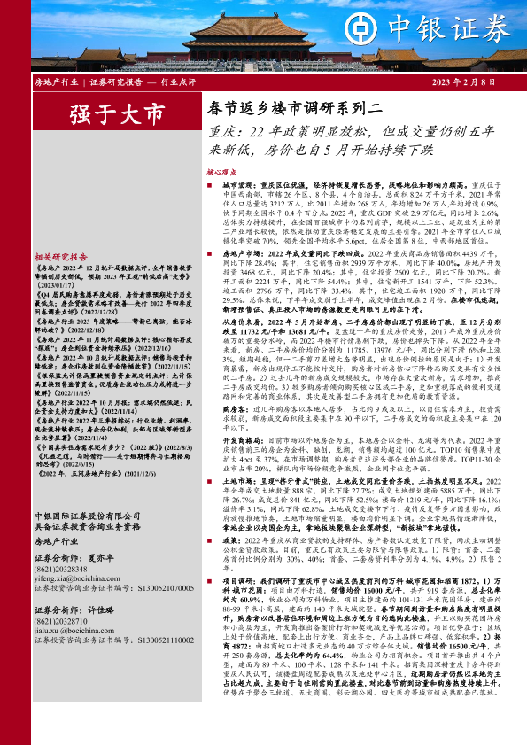 【中银证券】【20230208】春节返乡楼市调研系列二:重庆:22年政策明显放松,但成交量仍创五年来新低,房价也自5月开始持续下跌-23页