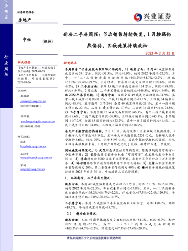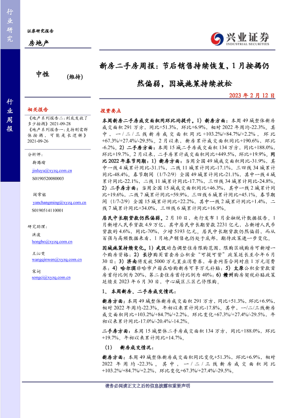 【兴业证券】【20230212】新房二手房周报:节后销售持续恢复,1月按揭仍然偏弱,因城施策持续放松-26页