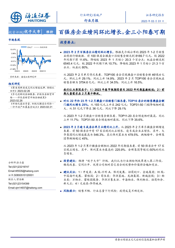 【海通证券】【20230301】房地产行业月报:百强房企业绩同环比增长,金三小阳春可期-11页
