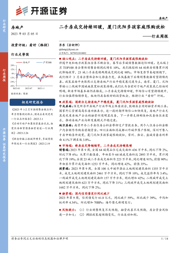 【开源证券】【20230305】房地产行业周报:二手房成交持续回暖,厦门沈阳多孩家庭限购放松-14页
