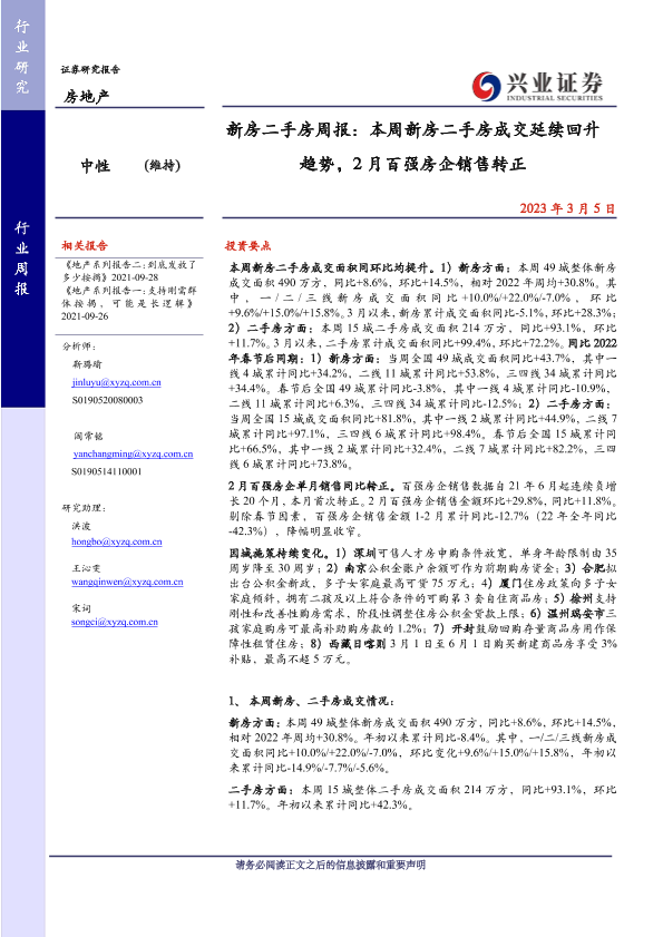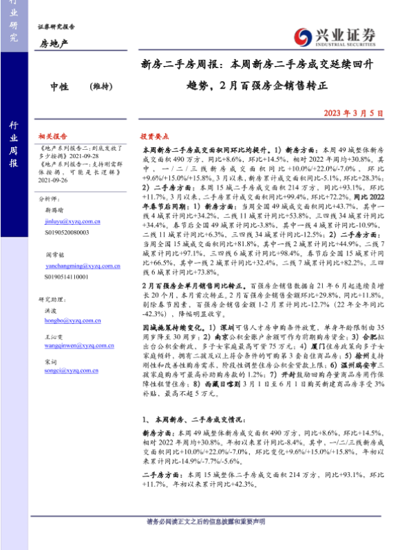 【兴业证券】【20230305】新房二手房周报:本周新房二手房成交延续回升趋势-26页