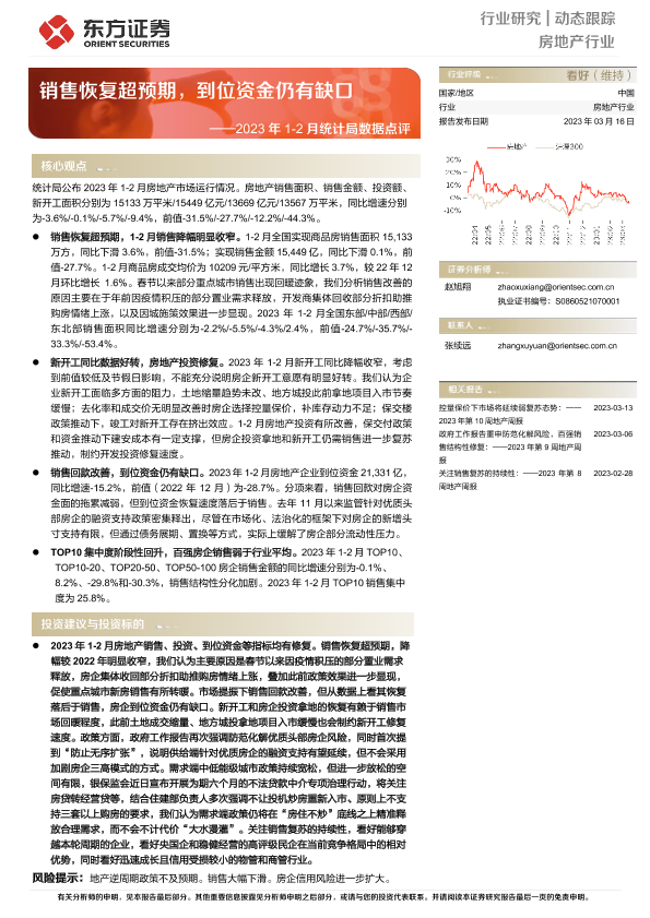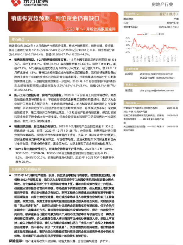 【东方证券】【20230316】房地产行业2023年1-2月统计局数据点评:销售恢复超预期,到位资金仍有缺口-10页