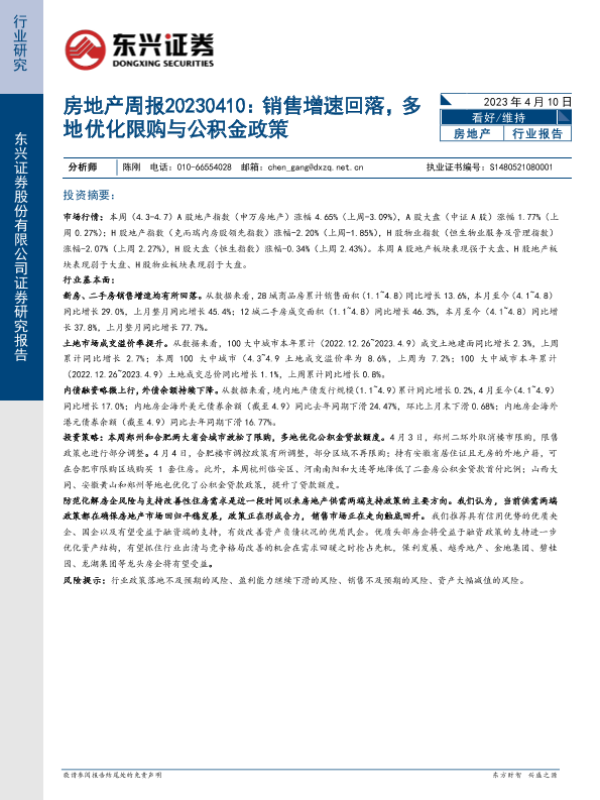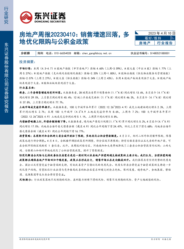 【东兴证券】【20230410】房地产周报:销售增速回落,多地优化限购与公积金政策-19页