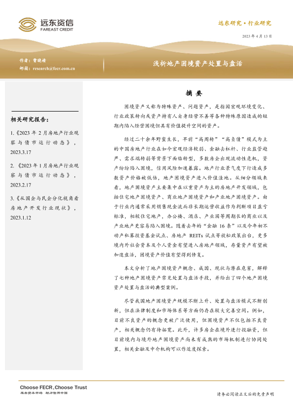 【远东资信】【20230413】浅析地产困境资产处置与盘活-15页