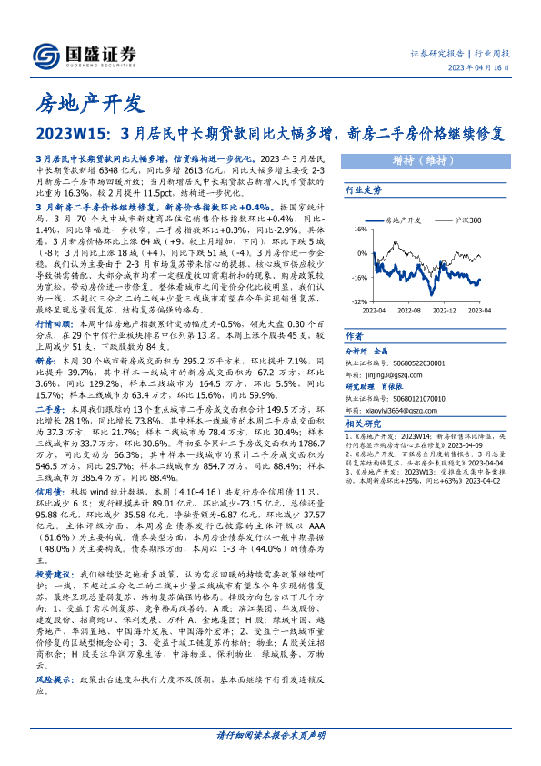 【国盛证券】【20230416】房地产开发2023W15:3月居民中长期贷款同比大幅多增,新房二手房价格继续修复-15页
