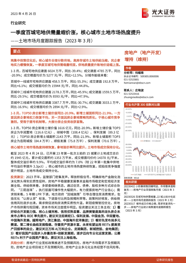 【光大证券】【20230426】一季度百城宅地供需量缩价涨,核心城市土地市场热度提升-16页
