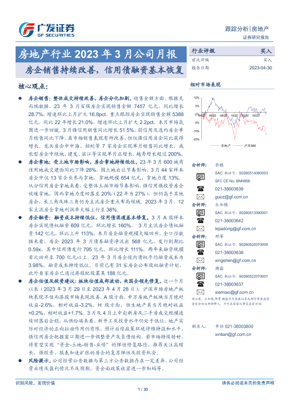 【广发证券】【20230430】房地产行业2023年3月公司月报:房企销售持续改善,信用债融资基本恢复-30页