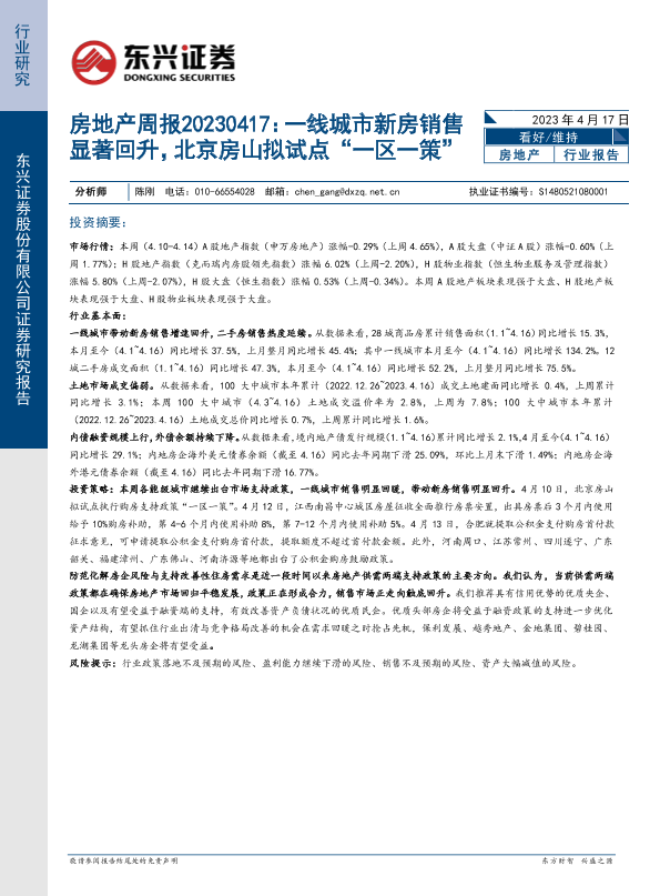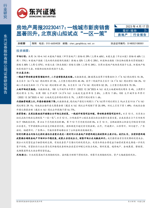 【东兴证券】【20230417】房地产行业周报:一线城市新房销售显著回升,北京房山拟试点“一区一策”-23页