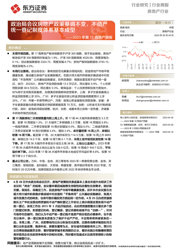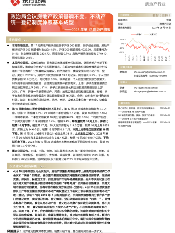 【东方证券】【20230504】房地产行业2023年第17周地产周报:政治局会议房地产政策基调不变,不动产统一登记制度体系基本成型-15页