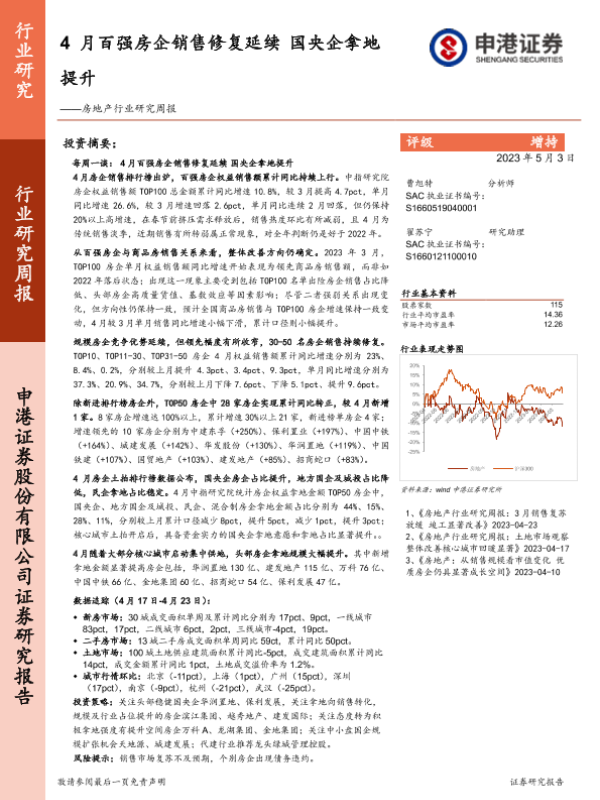 【申港证券】【20230503】4月百强房企销售修复延续 国央企拿地提升-12页