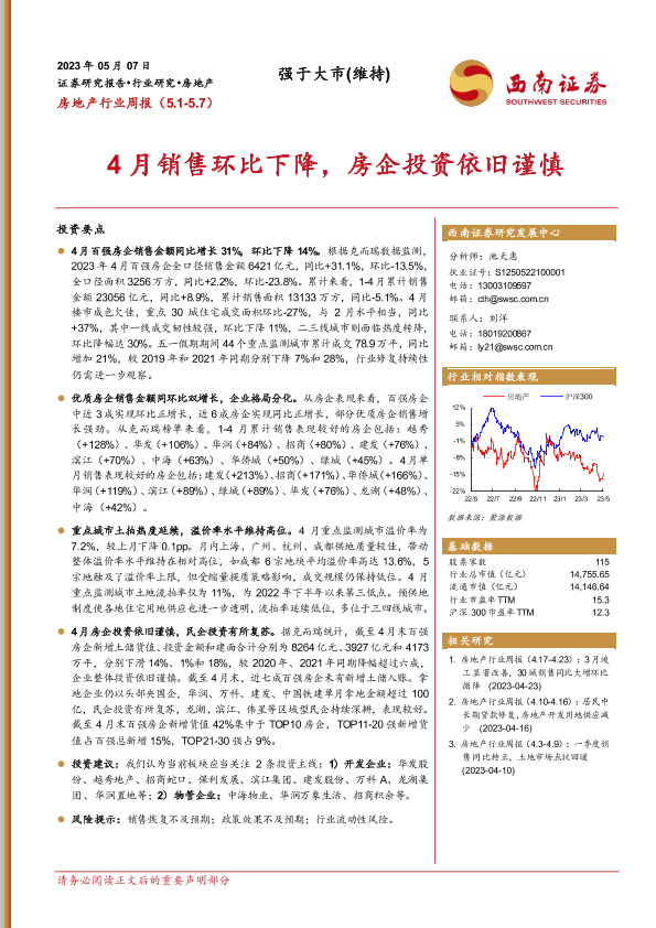 【西南证券】【20230507】房地产行业周报:4月销售环比下降,房企投资依旧谨慎-14页
