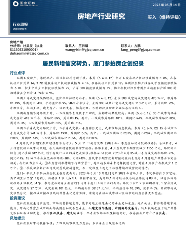 【国金证券】【20230514】居民新增信贷转负,厦门参拍房企创纪录-18页