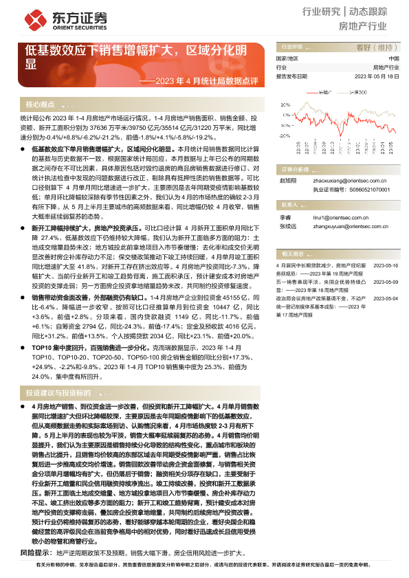 【东方证券】【20230518】房地产行业2023年4月统计局数据点评:低基数效应下销售增幅扩大,区域分化明显-10页