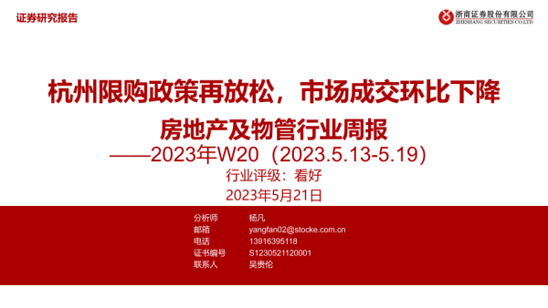 【浙商证券】【20230521】房地产及物管行业周报:杭州限购政策再放松,市场成交环比下降-26页