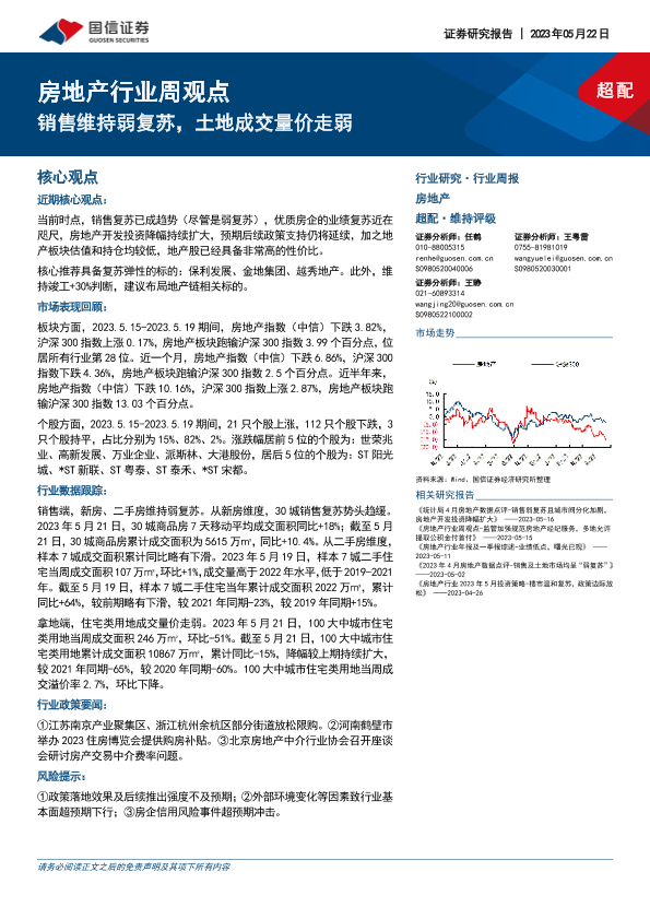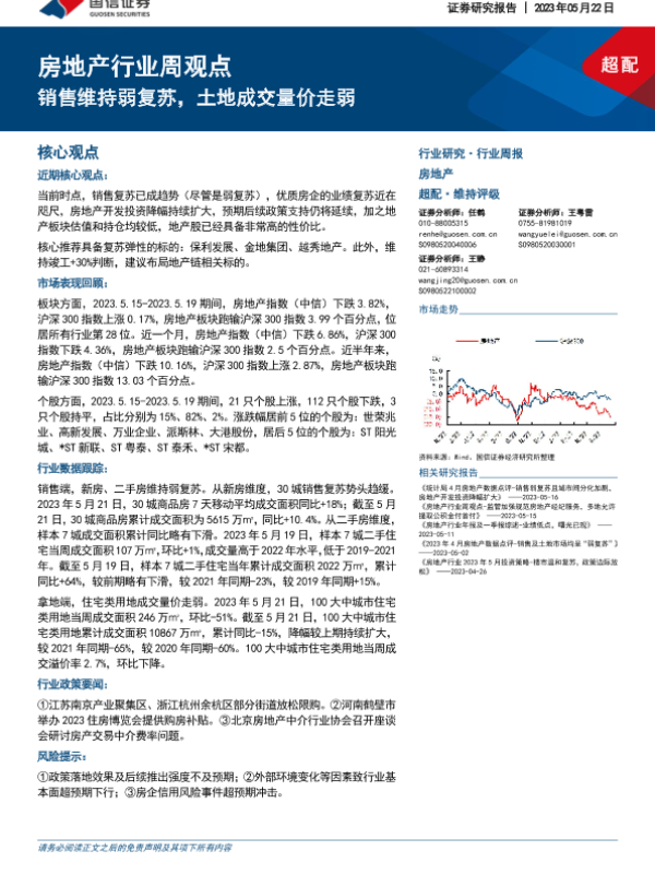 【国信证券】【20230522】房地产行业周观点:销售维持弱复苏,土地成交量价走弱-11页