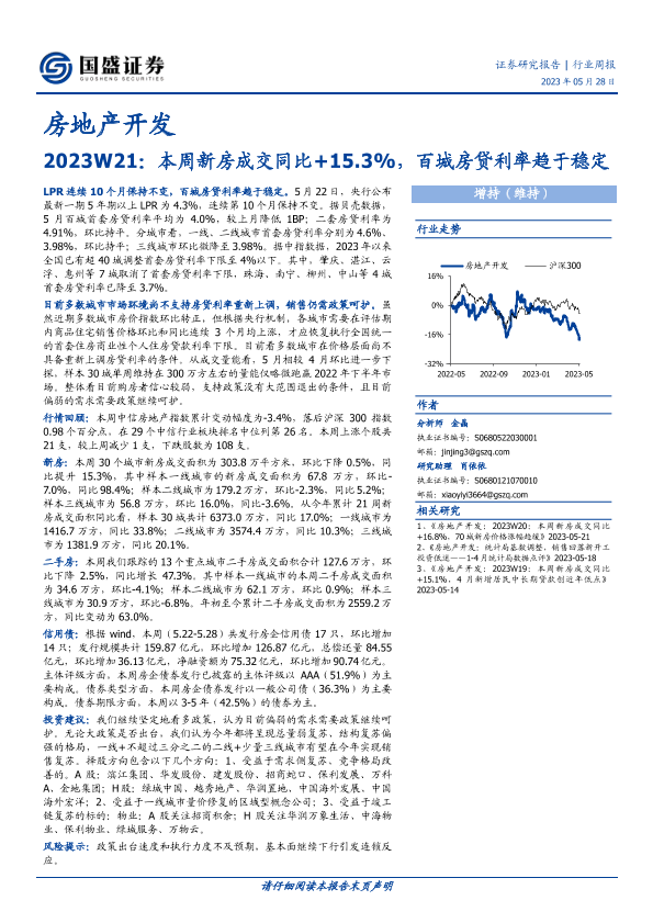 【国盛证券】【20230528】房地产开发2023W21:本周新房成交同比+15.3%,百城房贷利率趋于稳定-13页
