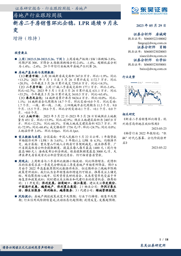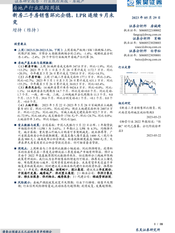 【东吴证券】【20230529】房地产行业跟踪周报:新房二手房销售环比企稳,LPR连续9月未变-18页