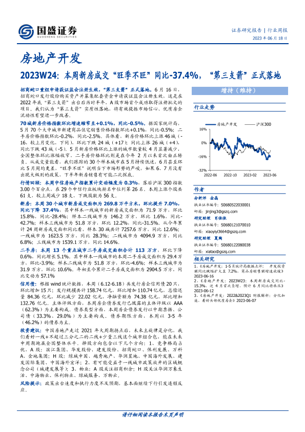 【国盛证券】【20230618】房地产开发2023W24:本周新房成交“旺季不旺”同比-37.4%,“第三支箭”正式落地-13页