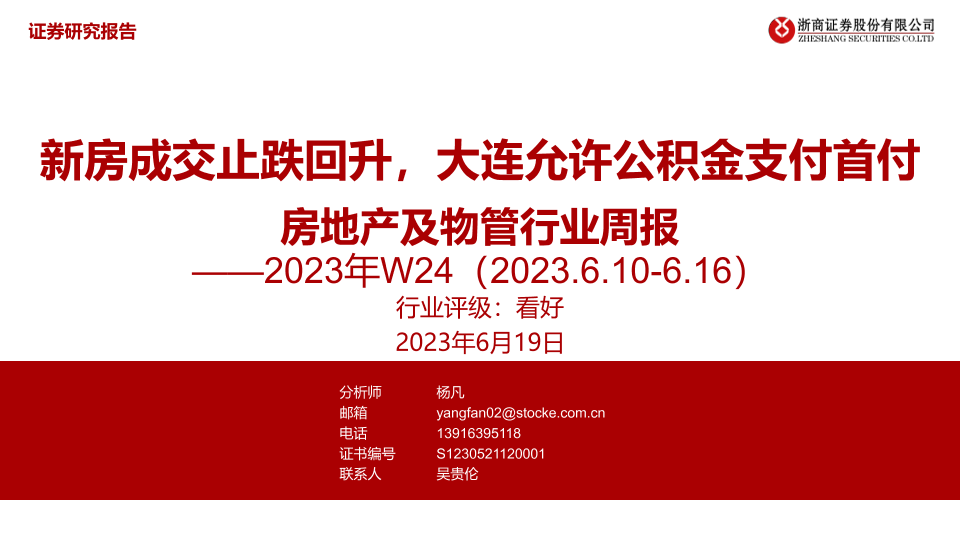 【浙商证券】【20230619】2023年W24房地产及物管行业周报:新房成交止跌回升,大连允许公积金支付首付-29页