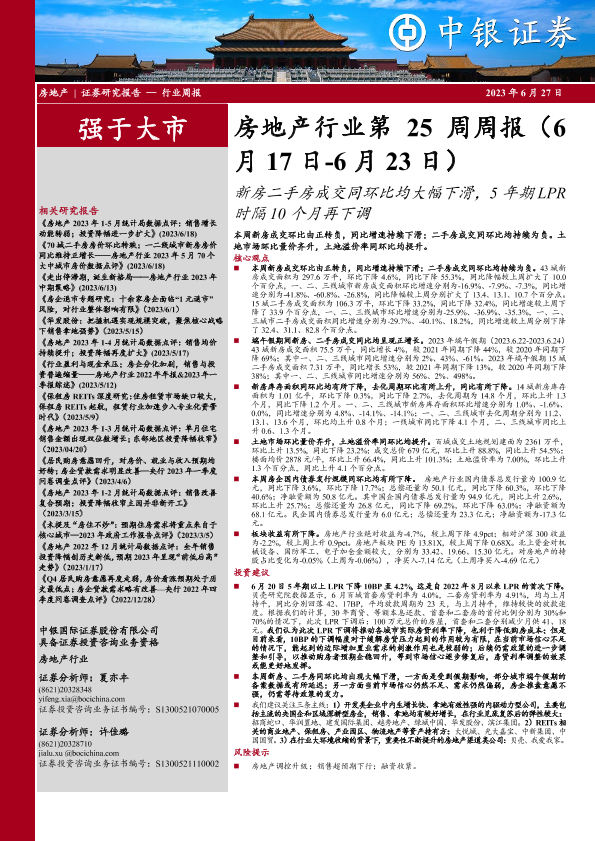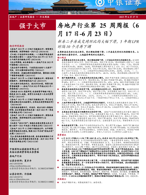 【中银证券】【20230627】房地产行业第25周周报:新房二手房成交同环比均大幅下滑,5年期LPR时隔10个月再下调-28页