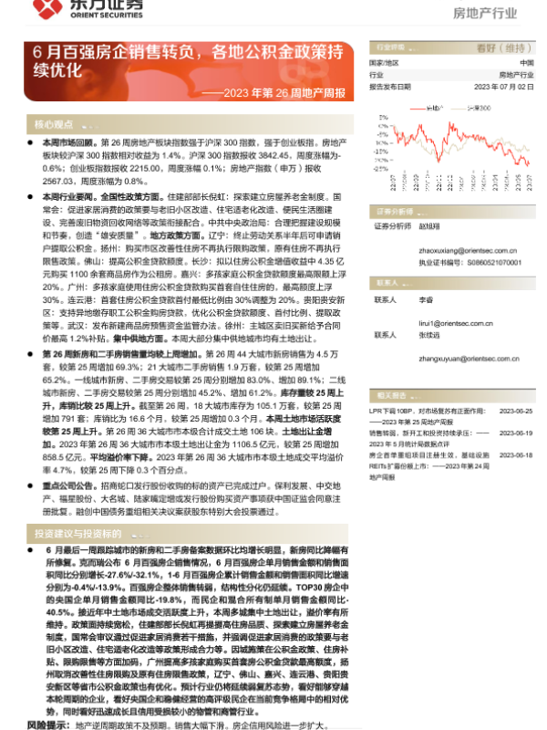 【东方证券】【20230702】2023年第26周地产周报:6月百强房企销售转负,各地公积金政策持续优化-16页