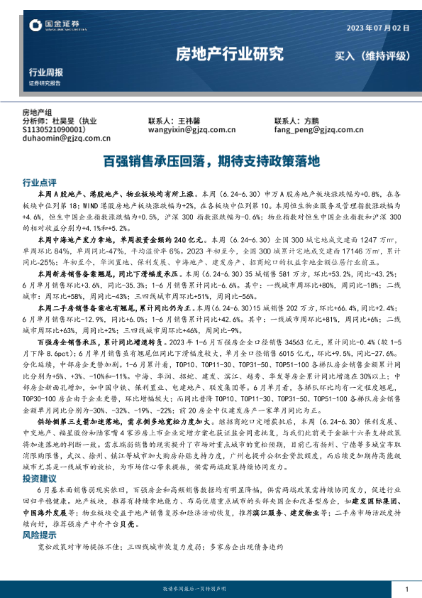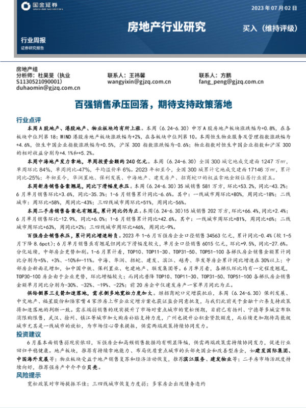【国金证券】【20230702】房地产行业研究:百强销售承压回落,期待支持政策落地-18页