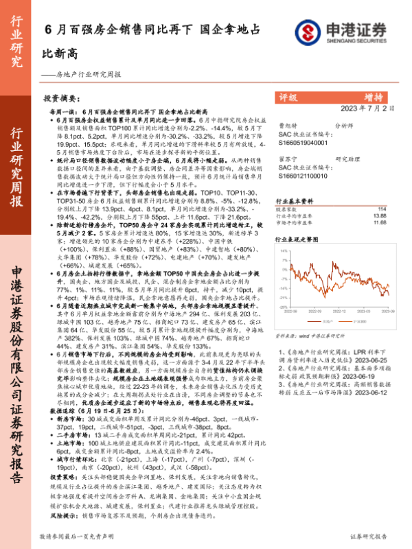 【申港证券】【20230702】6月百强房企销售同比再下 国企拿地占比新高-13页