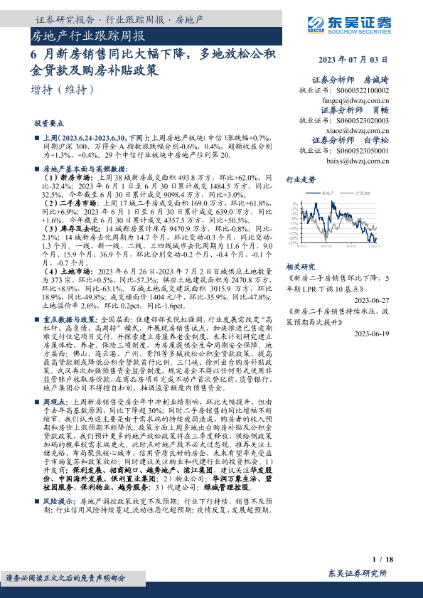 【东吴证券】【20230703】6月新房销售同比大幅下降,多地放松公积金贷款及购房补贴政策-18页