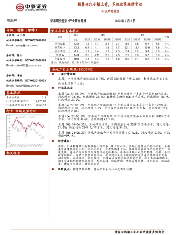 【中泰证券】【20230702】销售环比小幅上升,多地政策继续宽松-16页